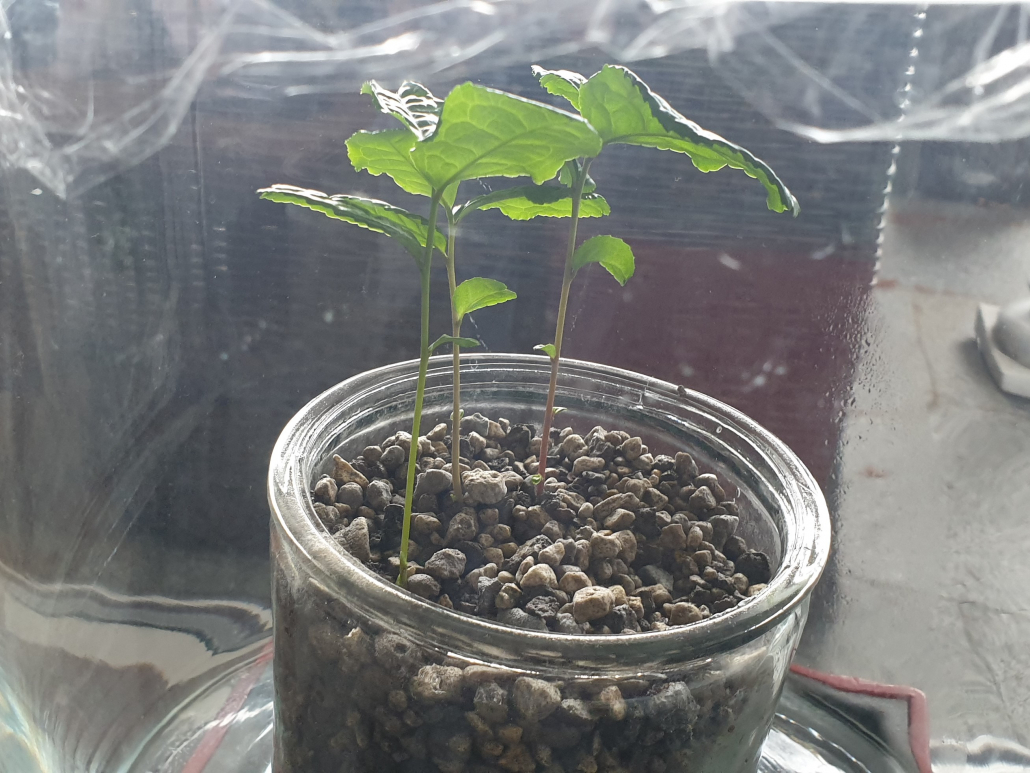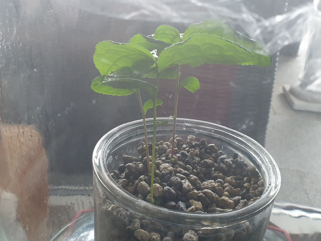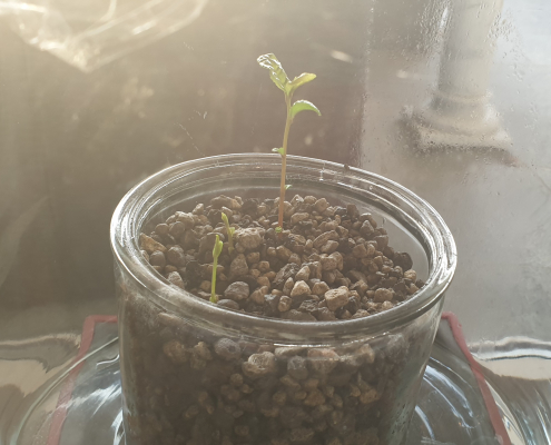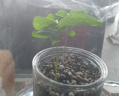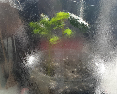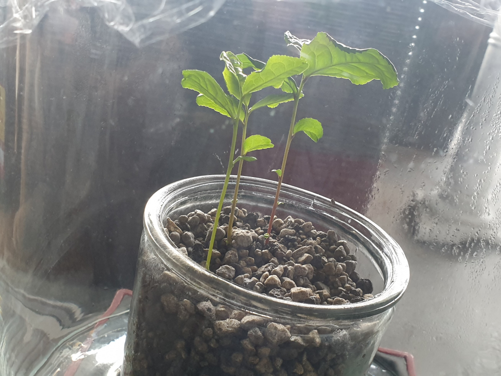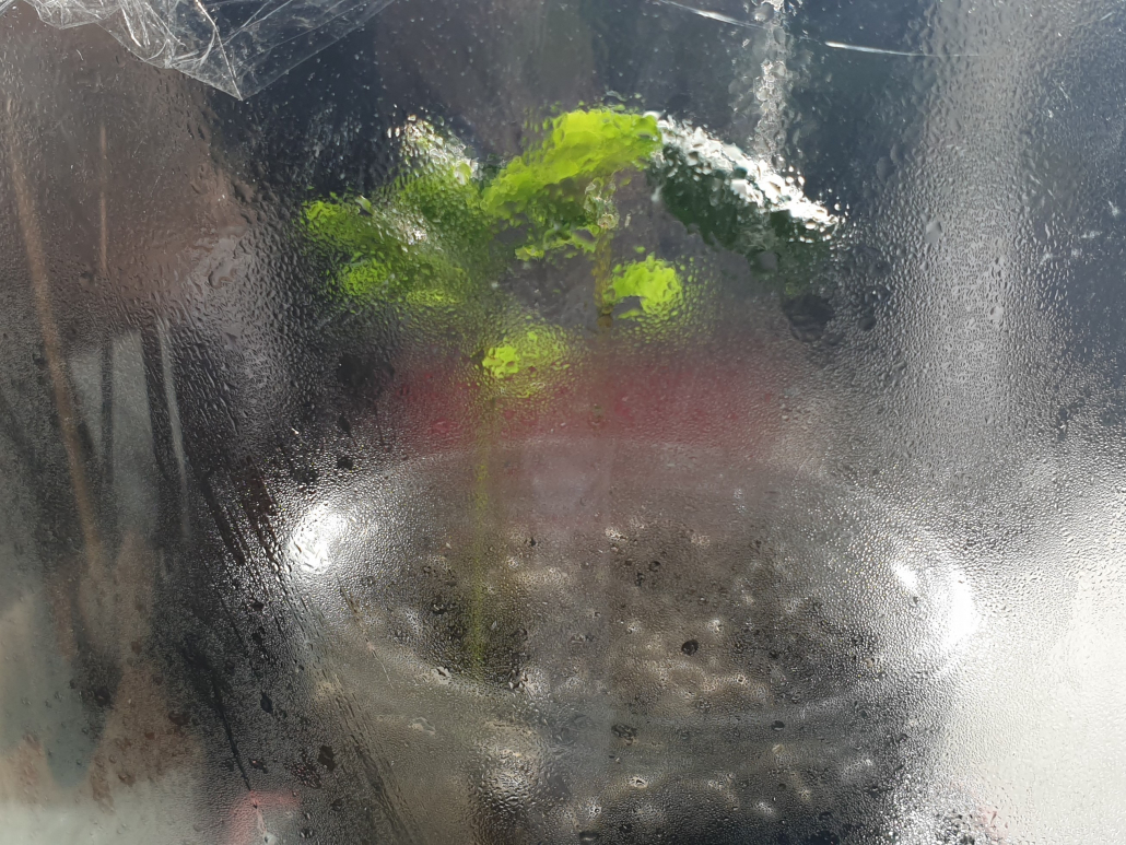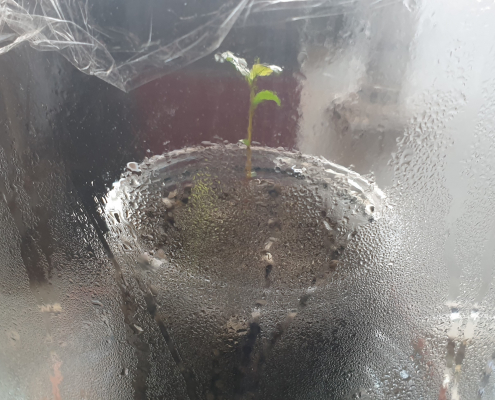 It is said that Camellia Sinensis requires a setting with an average temperature of at least 22°. In all fairness, it is a tropical plant. Mist is a problem at home, too, and so I created a simple glass house. In fact, what I am using in the pictures above is a large glass pot covered with cling film. It stands behind a window where the sun shines in for a few minutes every day. This brings up the interior temperature in my glass house, some water starts to evaporate from the little pot, and thus a humid interior is obtained underneath the cling film.