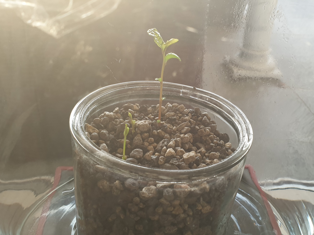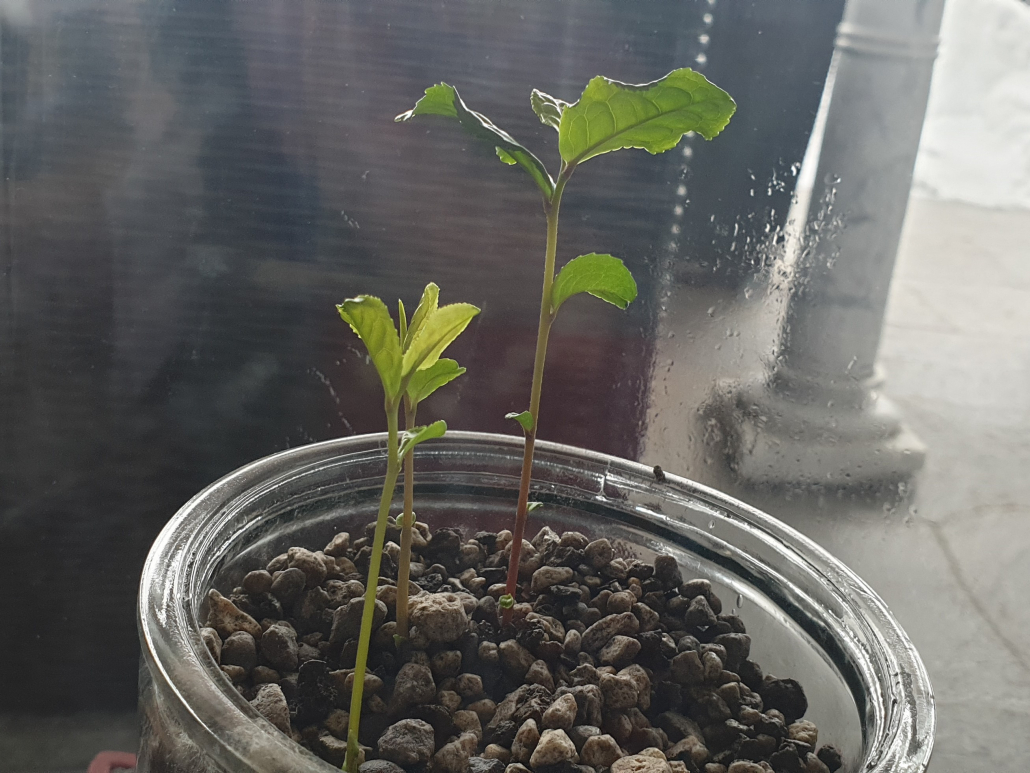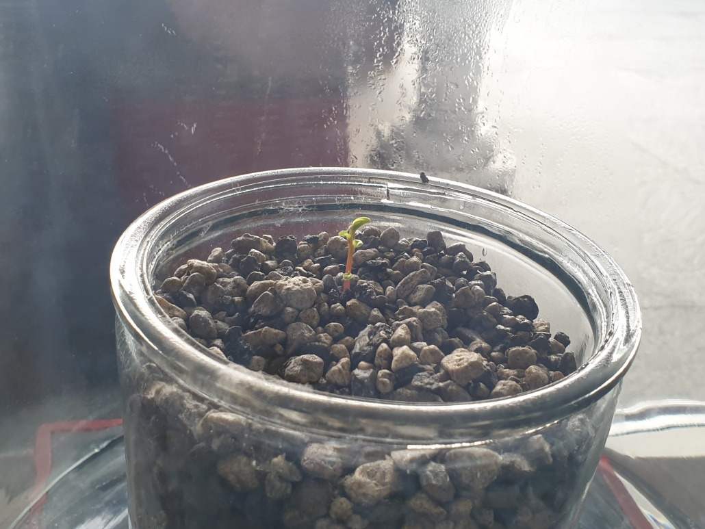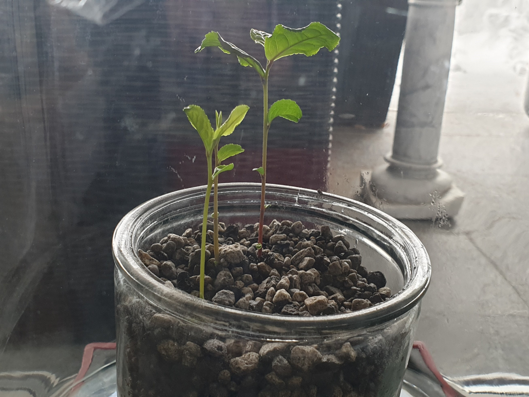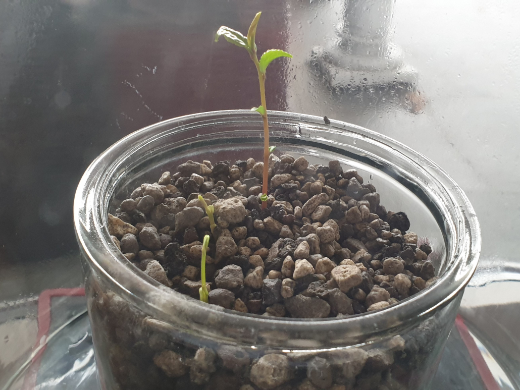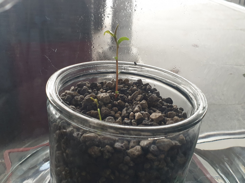 It is said that Camellia Sinensis requires a setting with an average temperature of at least 22°. In all fairness, it is a tropical plant. Mist is a problem at home, too, and so I created a simple glass house. In fact, what I am using in the pictures above is a large glass pot covered with cling film. It stands behind a window where the sun shines in for a few minutes every day. This brings up the interior temperature in my glass house, some water starts to evaporate from the little pot, and thus a humid interior is obtained underneath the cling film.